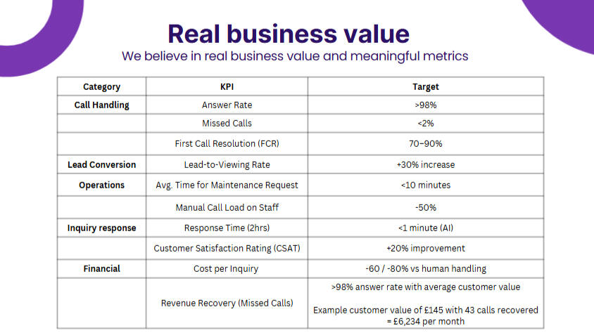 Callee AI uses industry standard metrics to measure the performance of your business. Before implementing Callee AI baseline metrics are set tailored to your business to measure the output value of the AI. These KPI's allow for data analytics and for before and after comparison of implementing Callee AI in quarterly reports. We aim to achieve these metrics through the